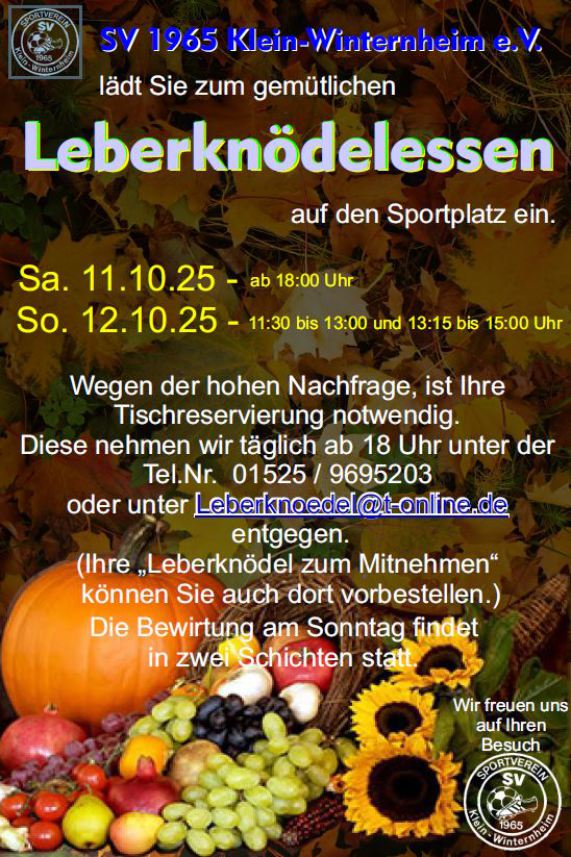 Wieder einmal findet unser traditionelles Leberknödelessen auf dem Sportplatz des SV 1965 Klein-Winternheim statt.